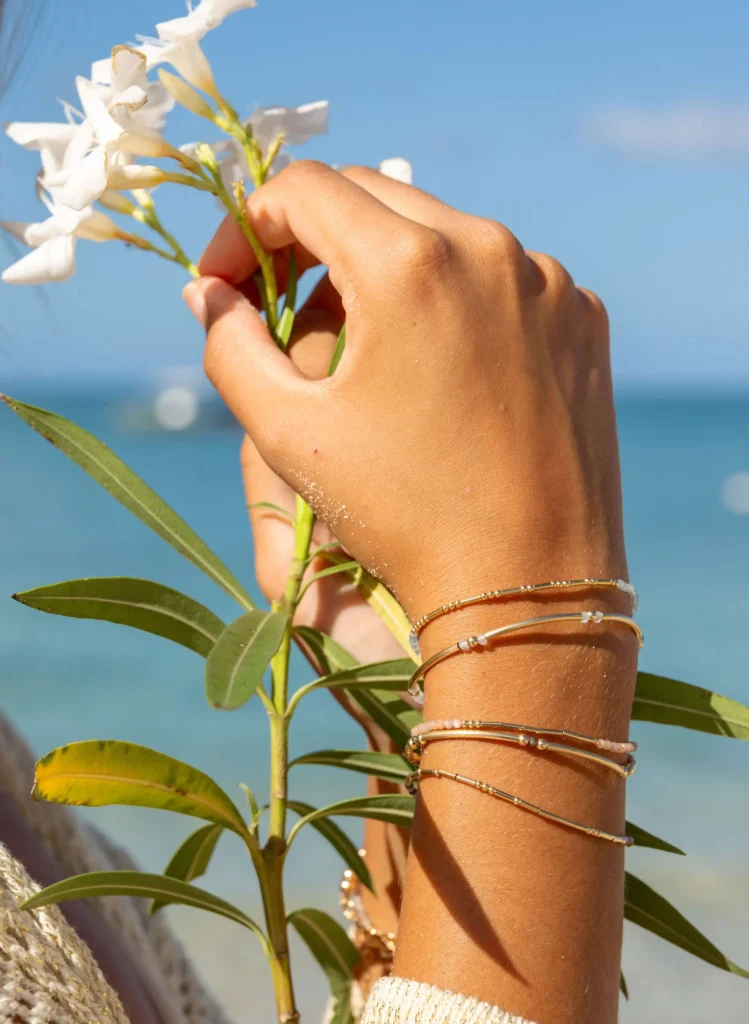 Associant la pierre de lune, liée à la douceur et à l’intuition, au cristal de roche, symbole de clarté et d’équilibre, cette collection évoque un chemin lumineux apaisé.