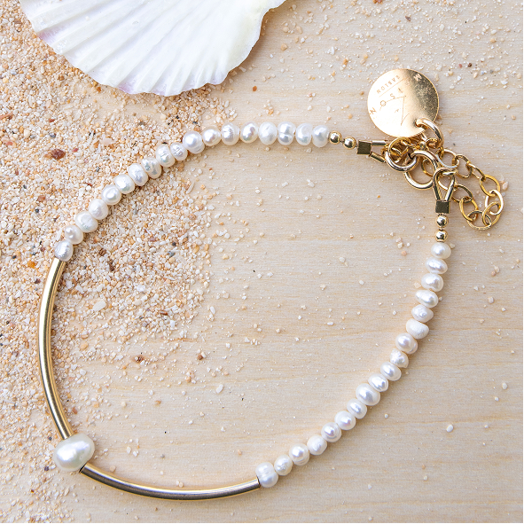 Délicat et structuré, le bracelet Naia associe des perles d'eau douce de 2mm à deux tubes incurvés en gold-filled 14K, ponctué d'une perle centrale naturelle de 5mm.